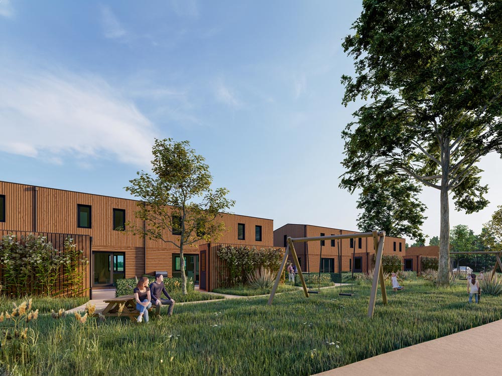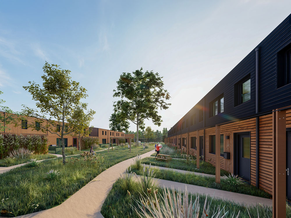 Twee rijen huizen van verschillende types, maar in dezelfde stijl. Er worden 8 starterswoningen van het type Nerf geplaatst in twee blokken van 4. De andere 10 geplande eengezinswoningen zijn van het type Noest. Door het verbinden van de prive tuinen met de binnentuin, ontstaat er een fijne plek waar bewoners elkaar ontmoeten. Natuurlijk zijn de houten woningen 90% biobased, volledig circulair en natuurinclusief.